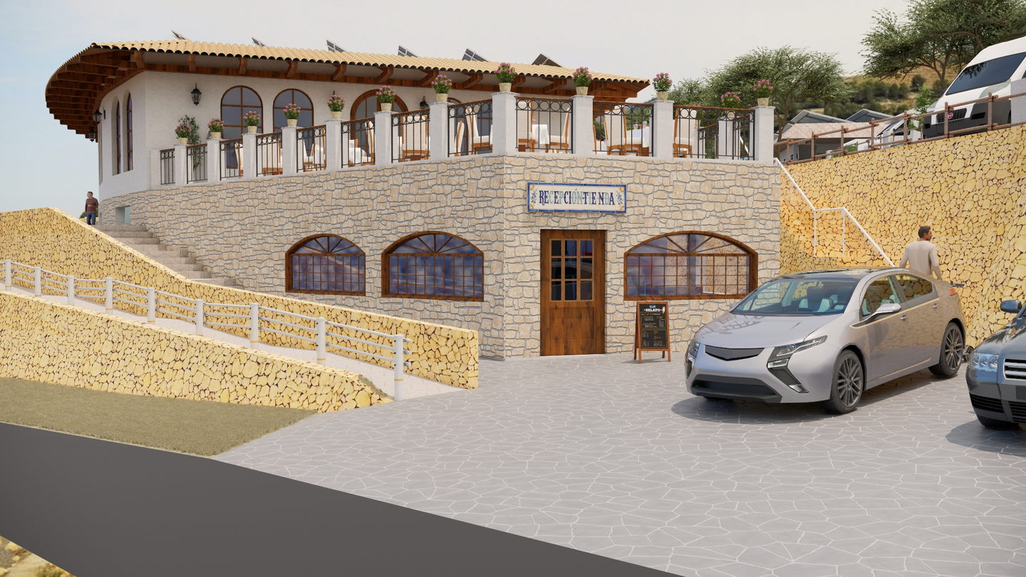 - En la primera terraza, situada en la parte más baja de la parcela, se construirá un edificio multifuncional (con recepción, tienda y bar-restaurante), una piscina al aire libre y un amplio aparcamiento para turismos.