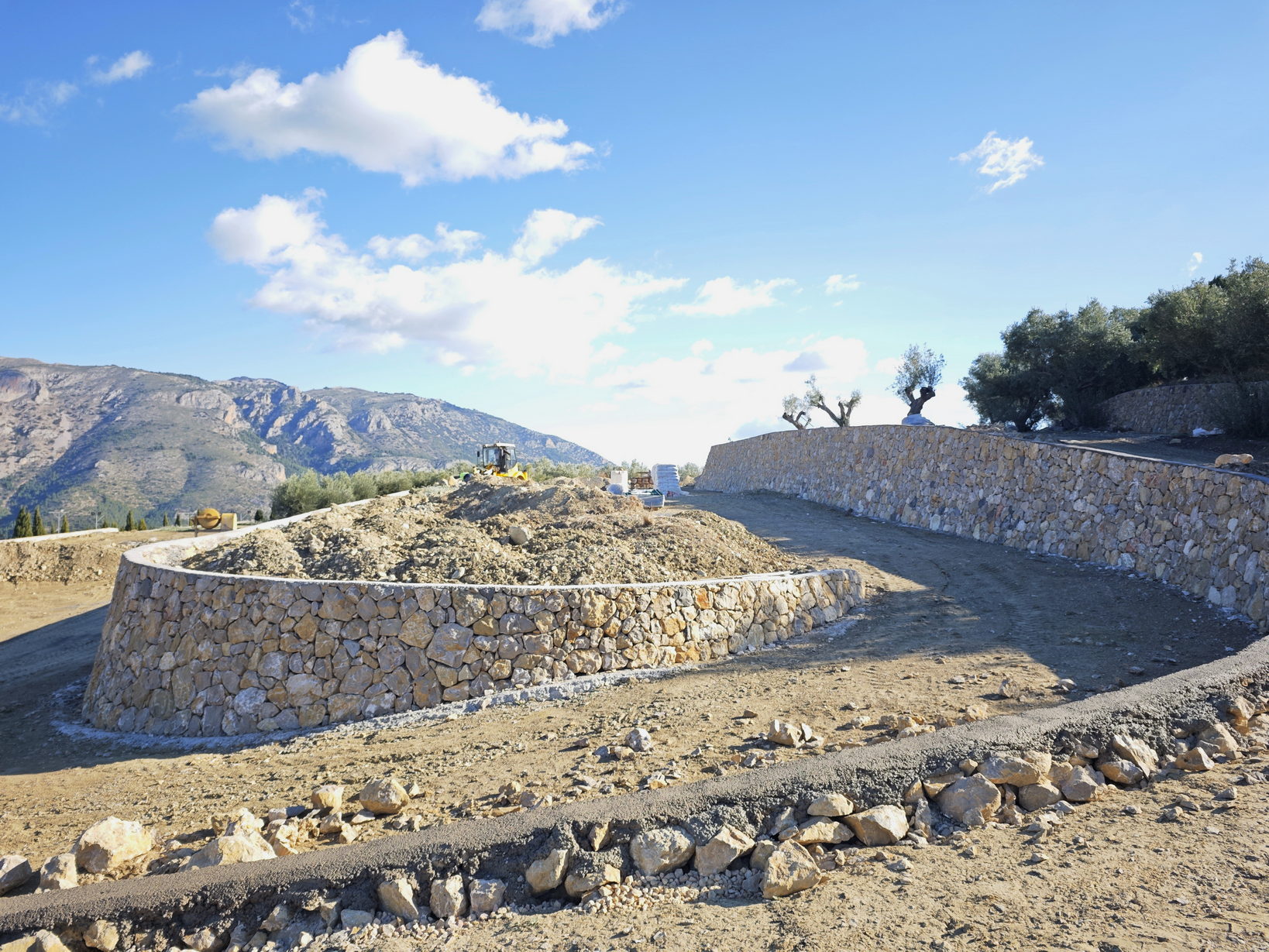 La construcción de los muros interiores de contención de las terrazas avanza a pleno ritmo. Para estos muros utilizamos una piedra muy elegante y con textura, con un bello dibujo multicolor procedente de Altea.