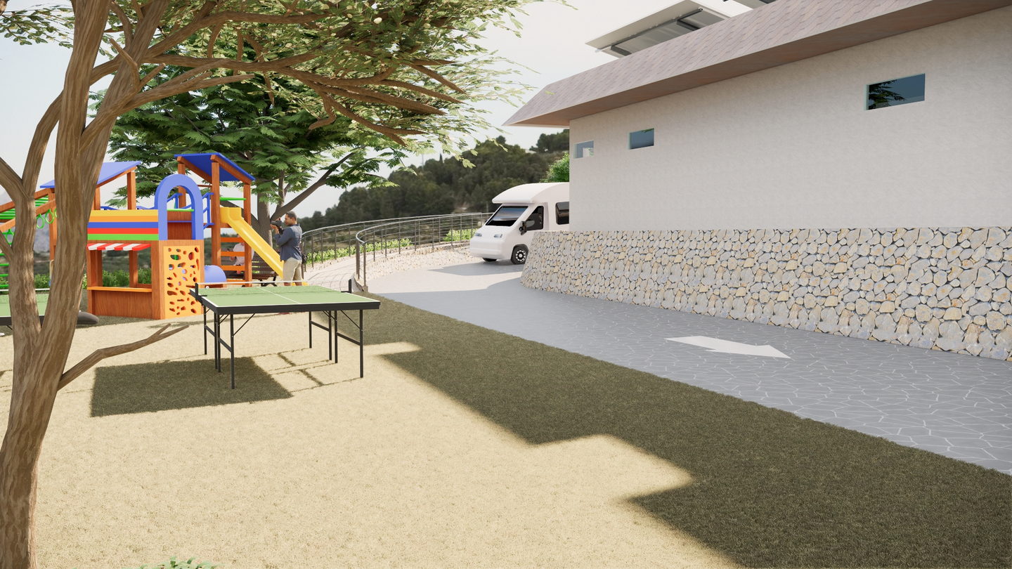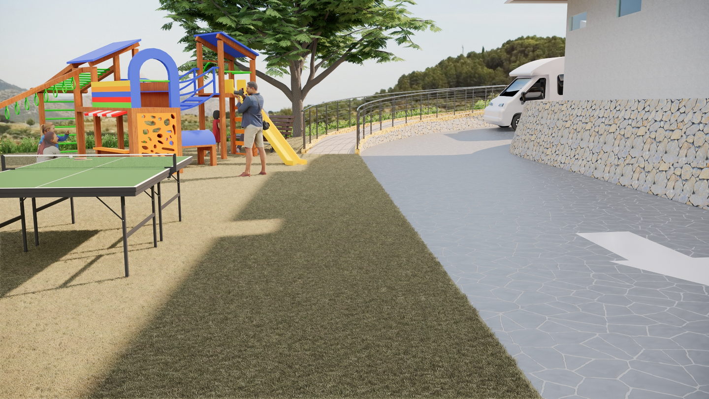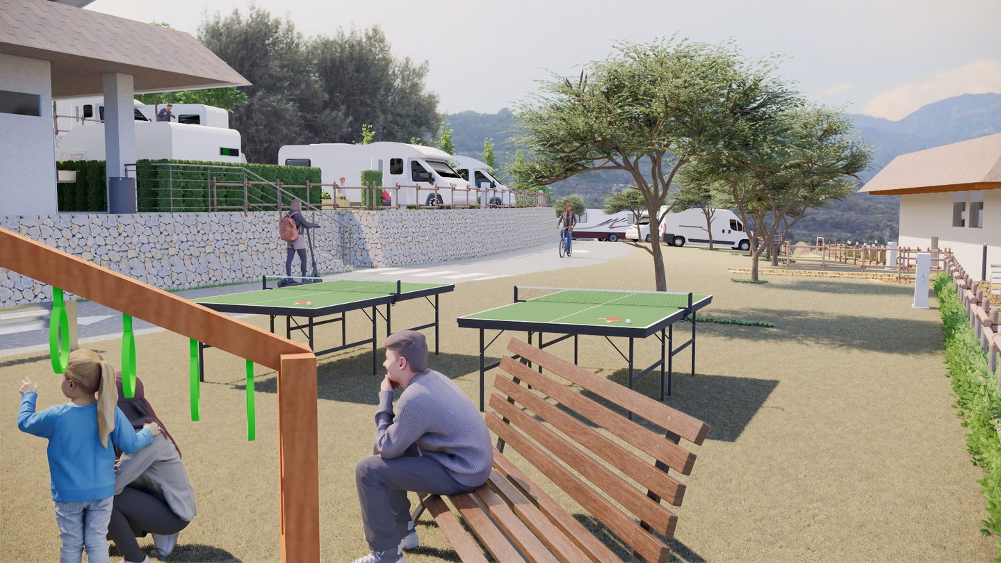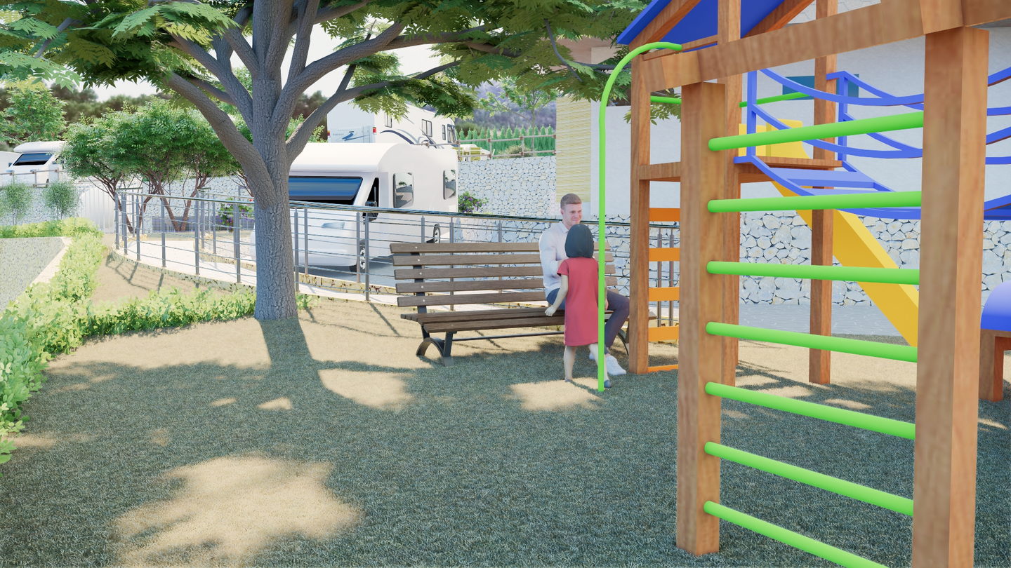 Climbing up from the intersection, you reach the cascade of residential areas of the campsite. Here, on the second, third, and fourth terraces, spacious pitches for motorhomes await you. Each parking spot is your own fully equipped space with electricity and water connections, and most also offer a sewer connection. The route first leads you to the third terrace — an important functional hub with a modern sanitary block featuring showers and a laundry room. From there, the path continues to the second terrace, the centre of active life in the campsite: here you’ll find a modern children’s playground and table tennis tables. Finally, on the top, fourth level, in an atmosphere of peace and seclusion, you will enjoy the best panoramic views of the mountains and the valley.