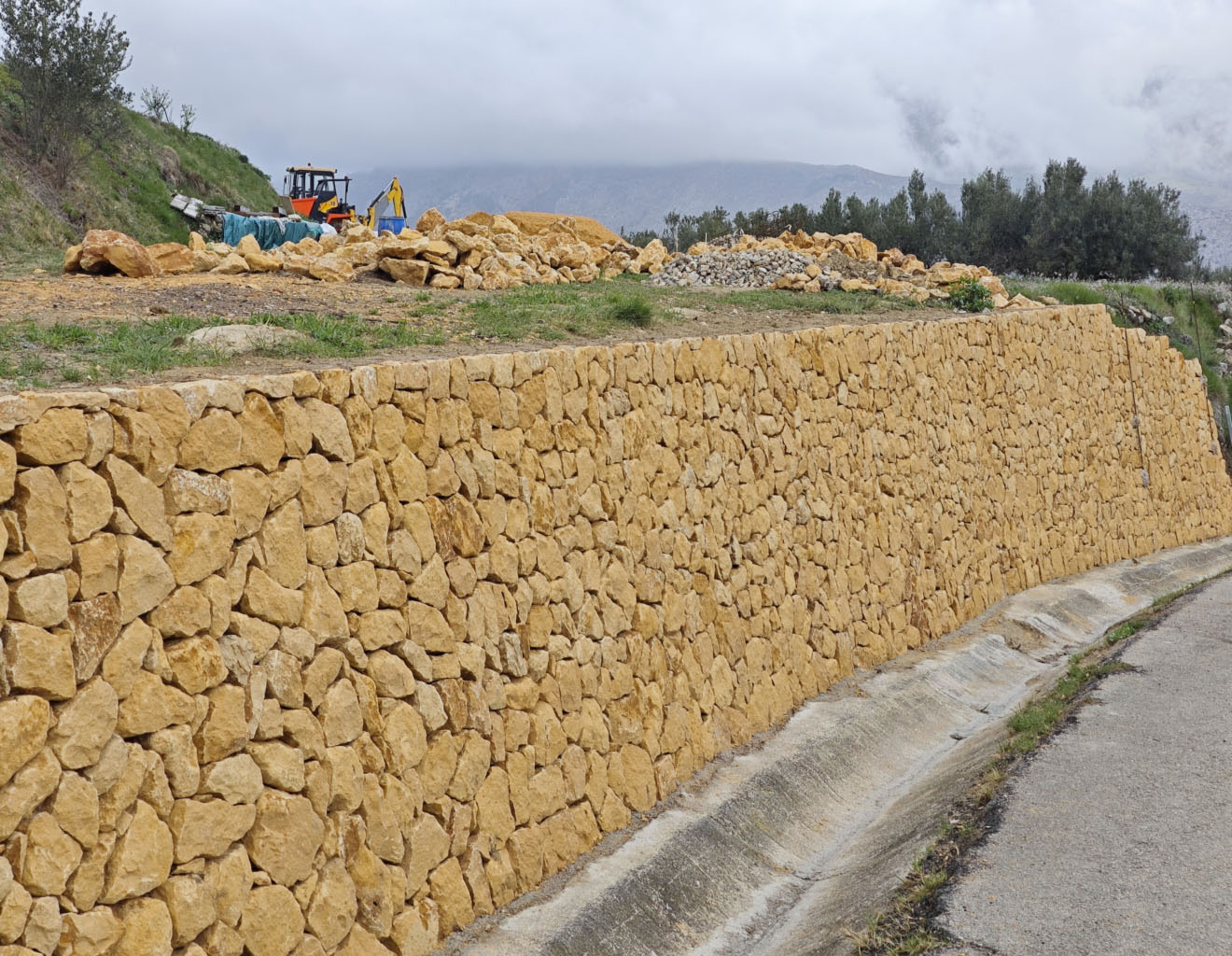 El ayuntamiento de Benimantell nos negó la conexión temporal a la red de agua que habíamos solicitado para llevar a cabo las obras de construcción de muros de contención de piedra. Argumentaron que, según ellos, para la construcción de dichos muros no se necesita agua y que la mampostería debe realizarse únicamente con piedra seca, sin utilizar mortero.