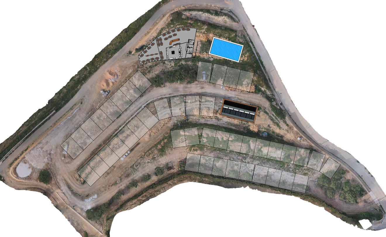 - En la primera terraza, situada en la parte más baja de la parcela, se construirá un edificio multifuncional (con recepción, tienda y bar-restaurante), una piscina al aire libre y un amplio aparcamiento para turismos.